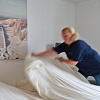Petra Hooyschuur is één van de dames die de netjes breit. “Dat doe ik al 18 jaar; zo’n 75 op een ochtend. Niet elke ochtend hoor. Onze afdeling maakt ook de servicepakketjes voor appartementen in de verhuur. De afwisseling vind ik leuk. Op de kwaliteit van de garnalennetjes ben ik hartstikke trots.”